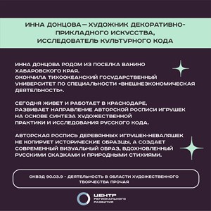 Знакомьтесь — Инна Донцова, художник декоративно-прикладного искусства, исследователь русского кода, создатель авторских игрушек-неваляшек! Через творчество креатор изучает глубокие смыслы русских традиций, переосмысливает материал в современном прочтении через призму прикладного творчества.