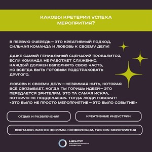 Вы узнаете больше о секретах организации крупных творческих проектов, вдохновитесь новыми идеями и погрузитесь в мир творчества! Татьяна также расскажет о критериях успеха мероприятия и объяснит, почему ей часто говорят: «Это было не просто мероприятие – это было событие!»