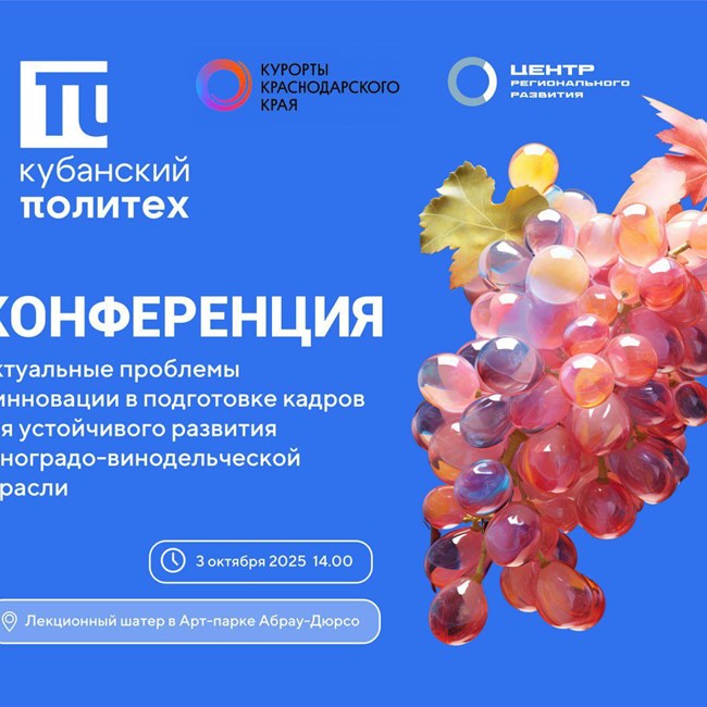 Центр регионального развития готовит серию интересных мероприятий. Начнем с первого: совместно с Кубанским государственным технологическим университетом организуем конференцию «Виноградарство и виноделие: инновации в подготовке кадров для устойчивого развития отрасли».