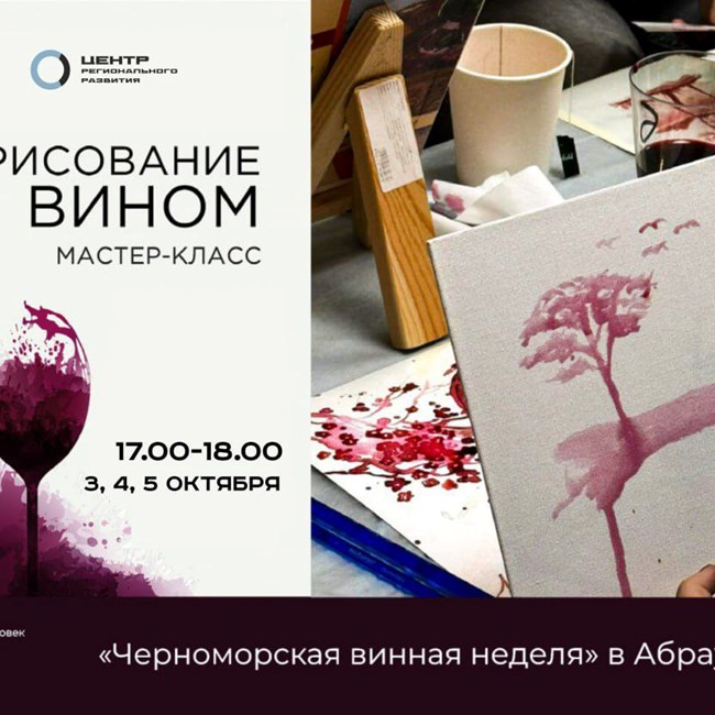 Заместитель начальника отдела развития креативных индустрий Елена Морозкина познакомит вас с уникальной техникой рисования с использованием вина. От вас потребуется лишь позитивный настрой. Почувствуйте себя художником. Количество мест ограничено, просим не опаздывать на начало мастер-класса.